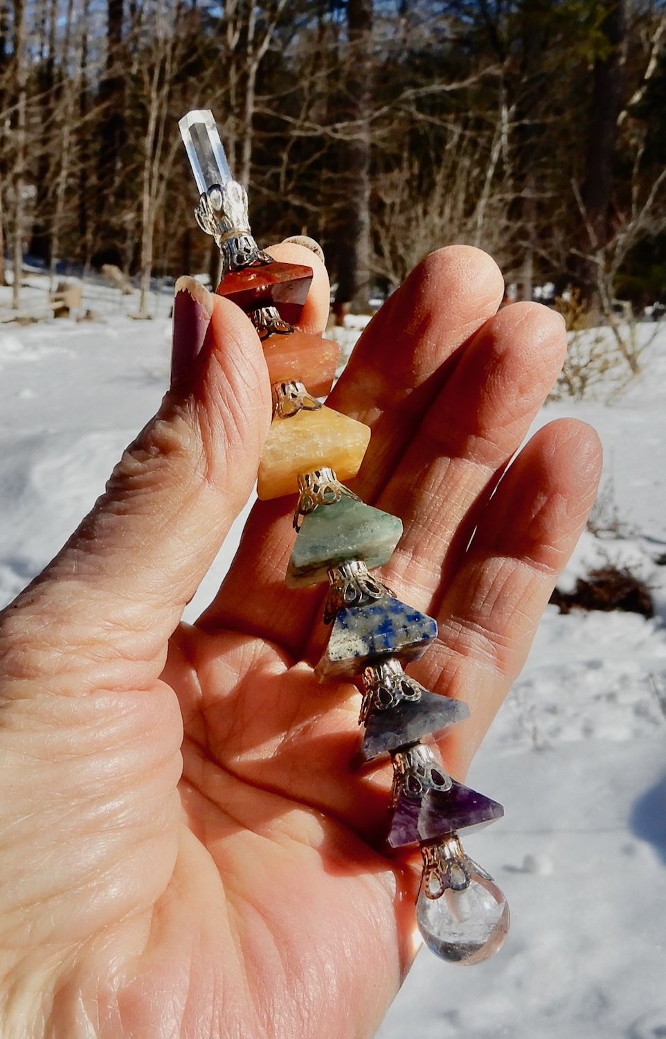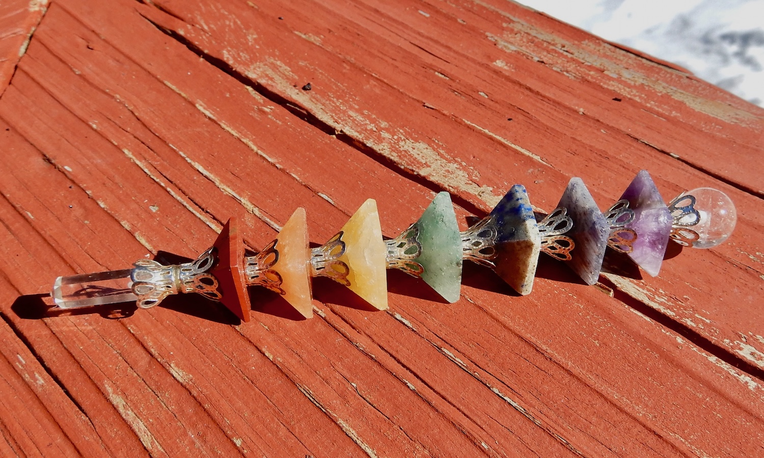 This amazing Chakra Pyramid Crystal Wand has a crystal for each chakra and clear quartz point for directing energy and a clear quartz sphere for spreading and smoothing out the energy.